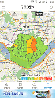 - 케이웨더의 독자적인 예보로, 전국 17개 권역의 미세먼지 / 초미세먼지 / 황사 / 오존 / 자외선의 2일치 예보를 제공